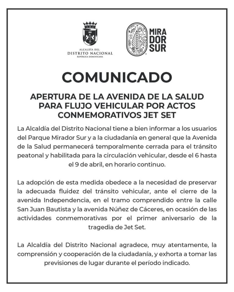 La Alcaldía del Distrito Nacional informó que la Avenida de la Salud, en el Parque Mirador Sur, estará cerrada al tránsito peatonal y habilitada solo para vehículos desde el 6 hasta el 9 de abril, de forma continua.