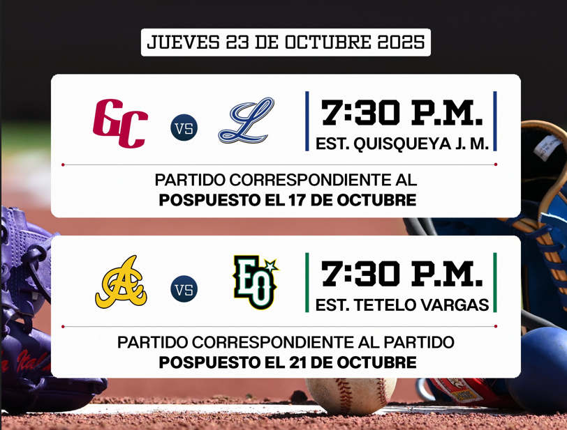 La Liga de Béisbol Profesional de la República Dominicana (Lidom) anunció que los partidos suspendidos el 17 y 21 de octubre entre los Tigres del Licey y los Gigantes del Cibao, así como el encuentro entre las Estrellas Orientales y las Águilas Cibaeñas, serán reprogramados para el jueves 23 de octubre.