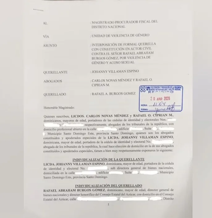 Santo Domingo.- Fue depositada una querella formal con constitución en actor civil contra el director general de Bienes Nacionales y director honorífico del Consejo Estatal del Azúcar (CEA), Rafael Abraham Burgos Gómez, por presunta violencia de género y acoso sexual.