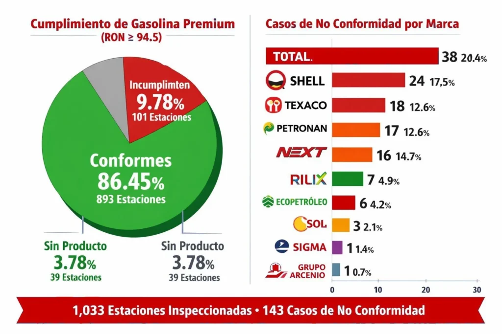 El informe detalla que 86.45% de las estaciones evaluadas (893) cumplieron con los parámetros establecidos, mientras que un 9.78% (101 estaciones) presentó fallas en el octanaje de gasolina premium (RON ≥ 94.5). Además, un 3.78% (39 estaciones) no disponía de producto al momento de la inspección.